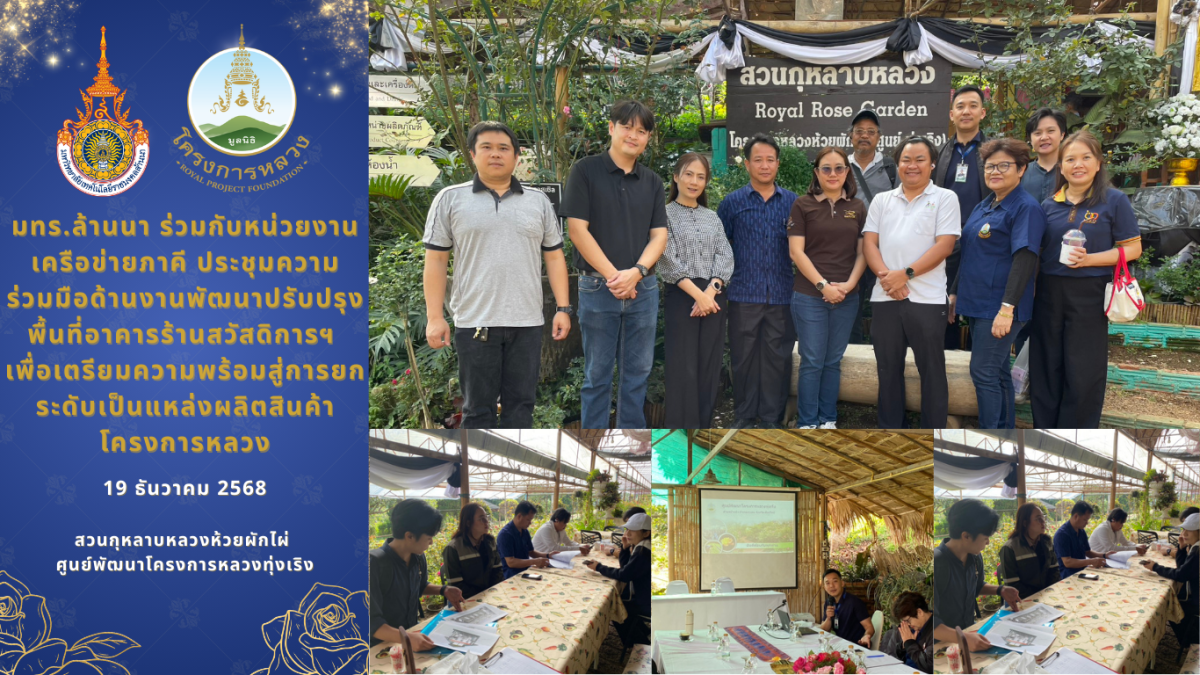 วันที่ 19 ธันวาคม 2568 ณ สวนกุหลาบหลวงห้วยผักไผ่ ศูนย์พัฒนาโครงการหลวงทุ่งเริง ได้จัดประชุมความร่วมมือด้านงานพัฒนาปรับปรุงพื้นที่อาคารร้านสวัสดิการฯ เพื่อเตรียมความพร้อมสู่การยกระดับเป็นแหล่งผลิตสินค้าโครงการหลวง และสถานที่ผลิตผลิตภัณฑ์แปรรูปของสวนกุหลาบหลวงห้วยผักไผ่ ผ่านความร่วมมือระหว่างคณะอาจารย์-บุคลากร มหาวิทยาลัยเทคโนโลยีราชมงคลล้านนา มหาวิทยาลัยเทคโนโลยีพระจอมเกล้าธนบุรี หน่วยทหารช่าง กองพลพัฒนาที่ 3 และเจ้าหน้าที่แผนกวิศวกรรม มูลนิธิโครงการหลวง ) โดย ร.ต.ธวัชชัย ภูมิวงค์ หัวหน้าศูนย์ฯ และนางยาณี ศรีเพ็ญ ผู้จัดการร้านฯ ให้การต้อนรับ กิจกรรมได้มีการจัดประชุมและลงพื้นที่สำรวจอาคารร้านสวัสดิการฯปัจจุบัน และพื้นที่โดยรอบ เพื่อวางแผนการปรับปรุงโดยผลการประชุมได้แผนปฏิบัติงาน (Action Plan) สำหรับการปรับปรุงพื้นที่อาคารร้านสวัสดิการฯ และการพัฒนาสถานที่ผลิตผลิตภัณฑ์แปรรูปตามมาตรฐานการผลิตอาหาร เพื่อนำเสนอคณะผู้บริหารมูลนิธิโครงการหลวงเข้าสู่กระบวนการพิจารณาในขั้นตอนต่อไป