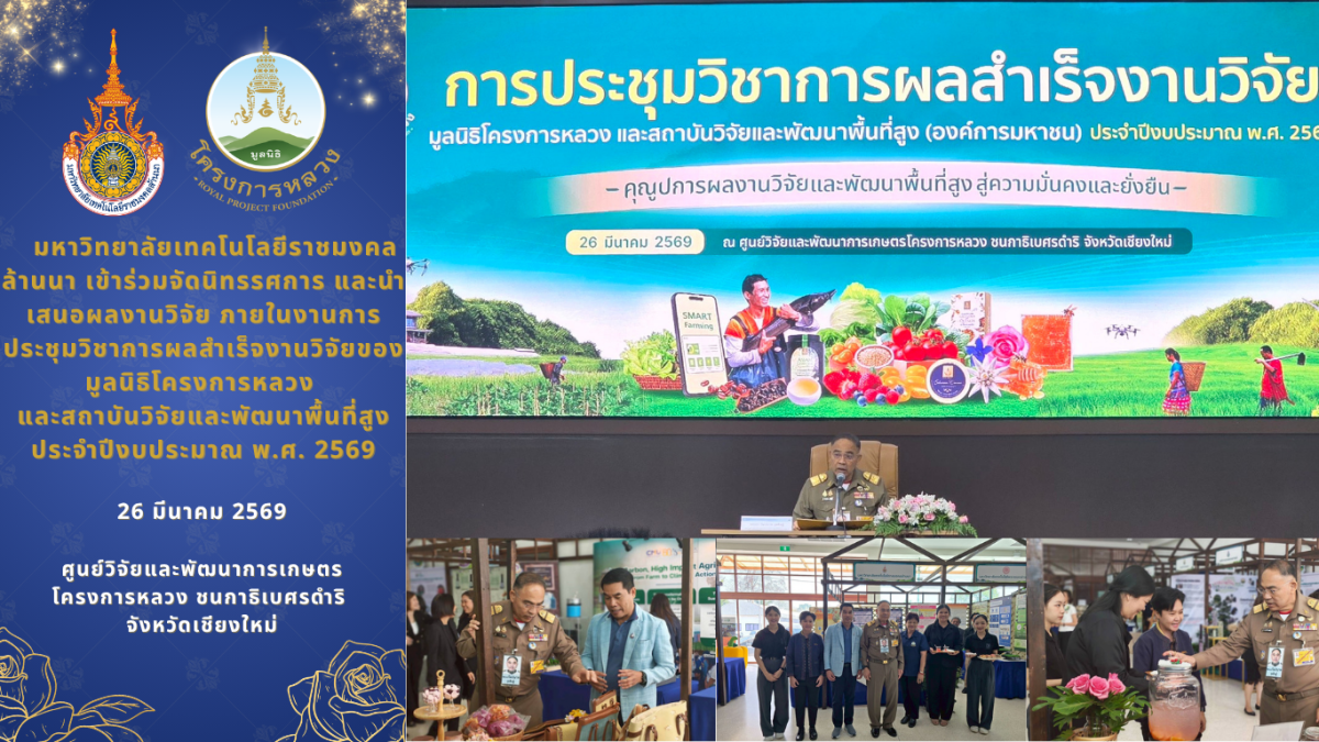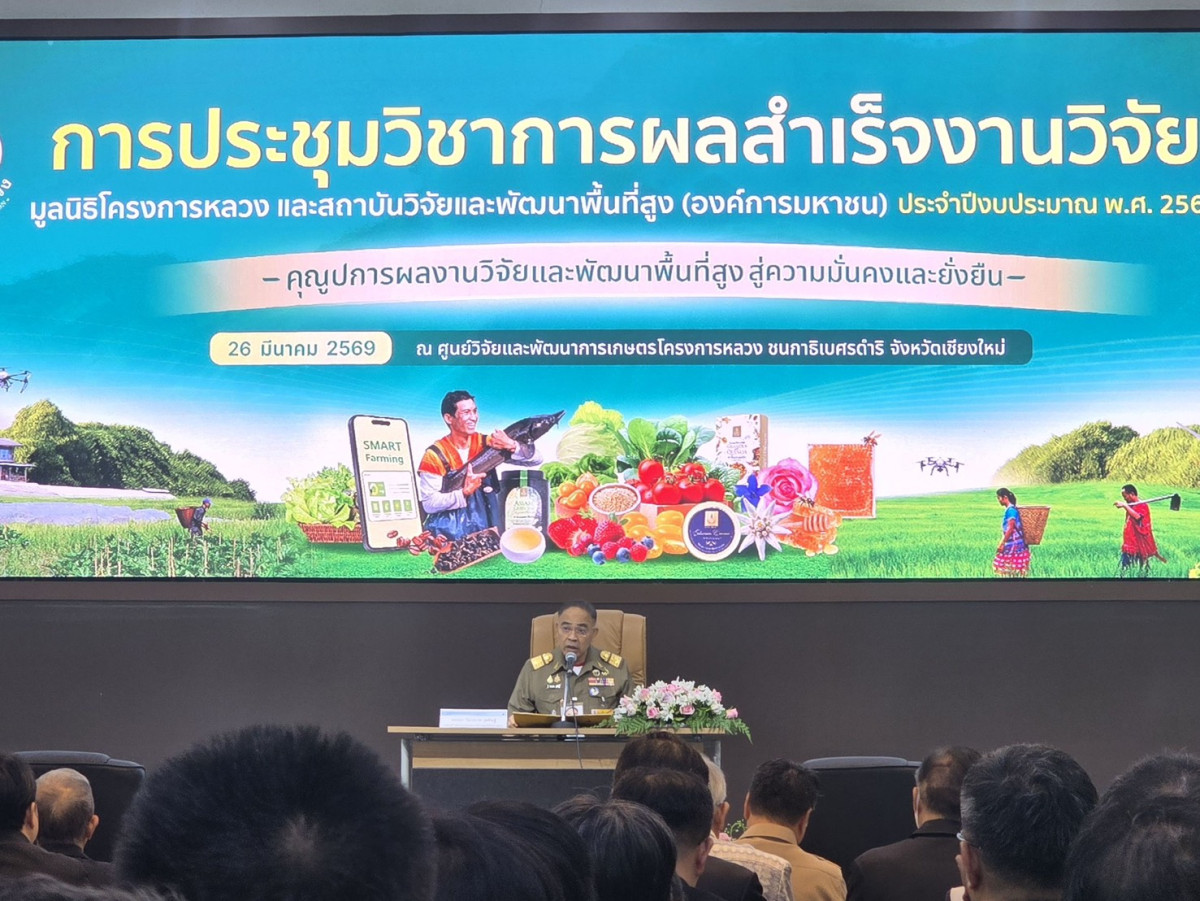วันที่ 26 มีนาคม 2569 มูลนิธิโครงการหลวง และสถาบันวิจัยและพัฒนาพื้นที่สูง (องค์การมหาชน) การประชุมวิชาการผลสำเร็จงานวิจัยของมูลนิธิโครงการหลวง และสถาบันวิจัยและพัฒนาพื้นที่สูง ประจำปีงบประมาณ พ.ศ. 2569 “คุณูปการผลงานวิจัยและพัฒนาพื้นที่สูง สู่ความมั่นคงและยั่งยืน” ณ ศูนย์วิจัยและพัฒนาการเกษตรโครงการหลวง ชนกาธิเบศรดำริ จังหวัดเชียงใหม่ โดยได้รับเกียรติจาก พลเอกกัมปนาท