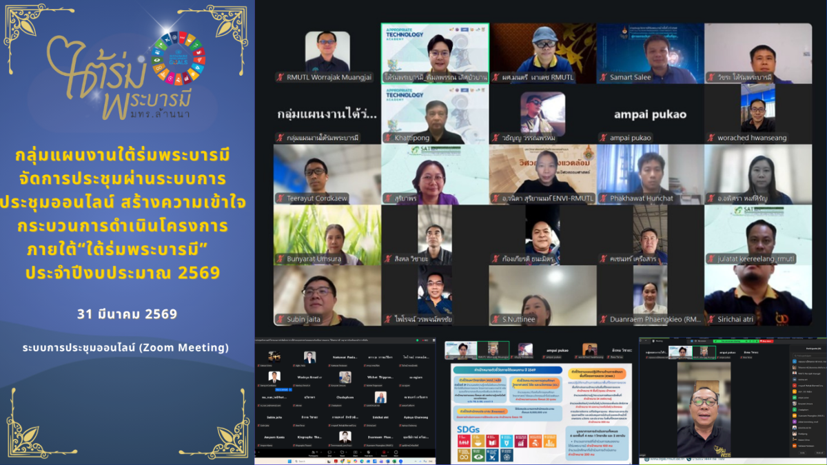วันที่ 31 มีนาคม พ.ศ. 2569 กลุ่มแผนงานใต้ร่มพระบารมี มหาวิทยาลัยเทคโนโลยีราชมงคลล้านนา จัดการประชุมผ่านระบบการประชุมออนไลน์ (Zoom Meeting) สร้างความเข้าใจกระบวนการดำเนินโครงการภายใต้ยุทธศาสตร์และแผนงานขับเคลื่อนการสนองงาน “ใต้ร่มพระบารมี” บนฐานการขับเคลื่อนงานวิชาการที่ยั่งยืน ประจำปีงบประมาณ 2569 ร่วมกับคณาจารย์ นักวิจัย และคณะทำงานโครงการ โดยมีผู้ช่วยศาสตราจารย์วรจักร์ เมืองใจ หัวหน้าหัวหน้าแผนงานใต้ร่มพระบารมี เป็นประธานกล่าวเปิดการประชุม